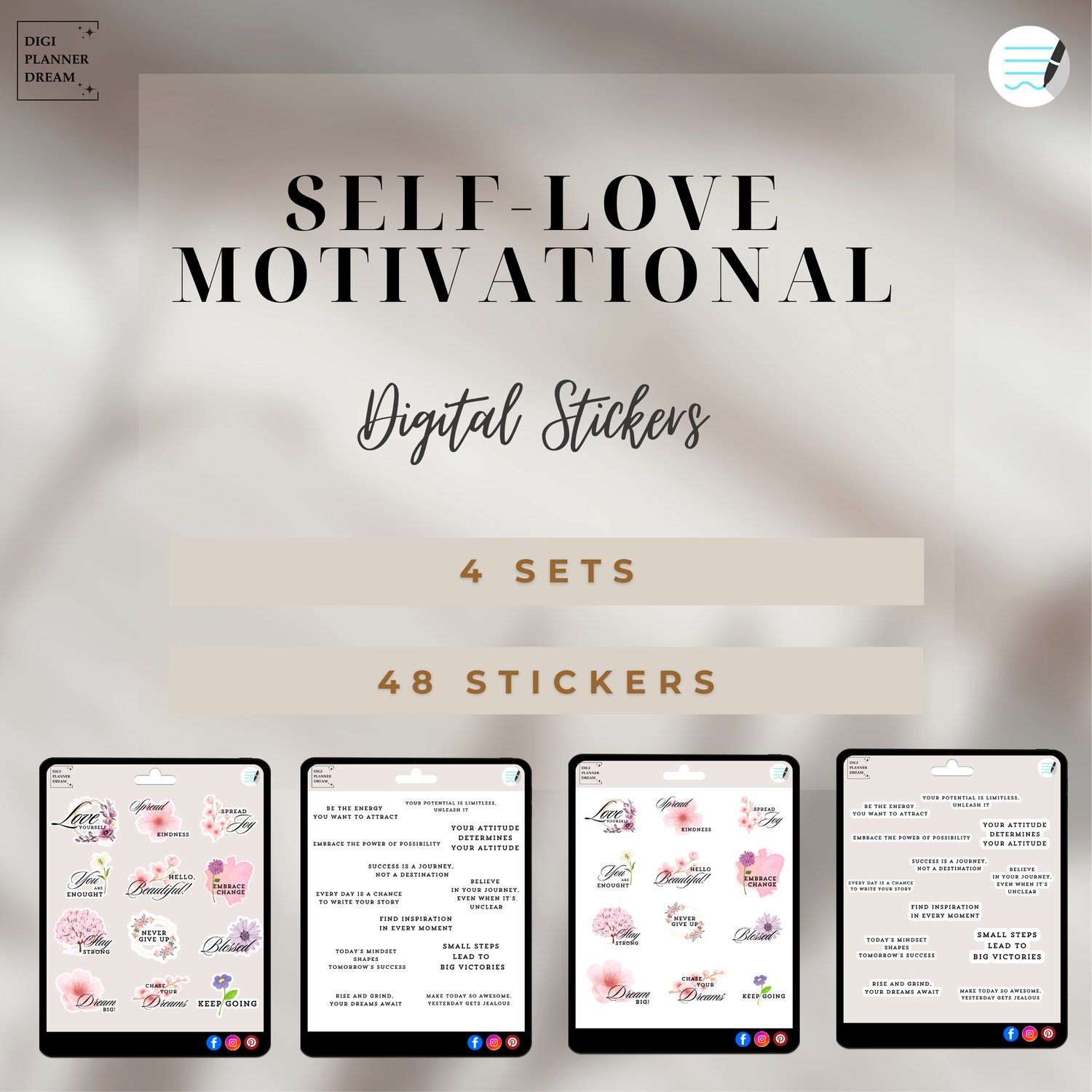 Elevate your mindset and embrace self-love with these 48 motivational digital stickers! Perfect for planners, journals, and digital scrapbooking, this set includes four unique designs: