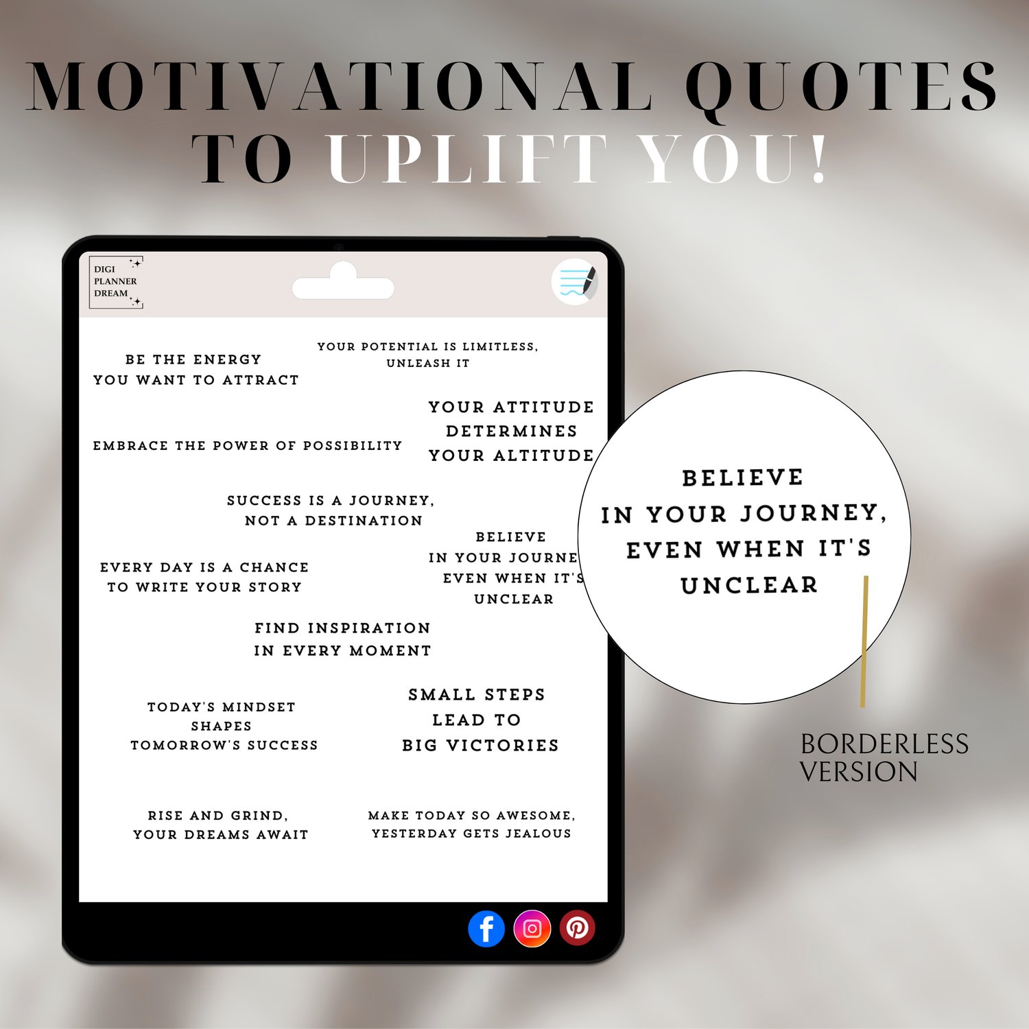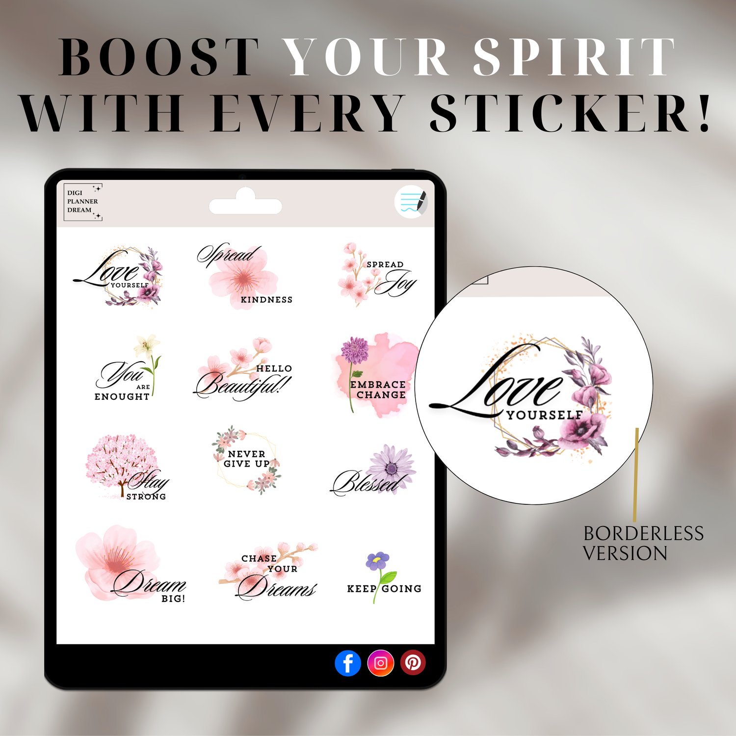 Inspirational motivational and self-love digital stickers for GoodNotes. 4 sets with 48 total stickers—includes bordered and borderless options. Perfect for digital planners.