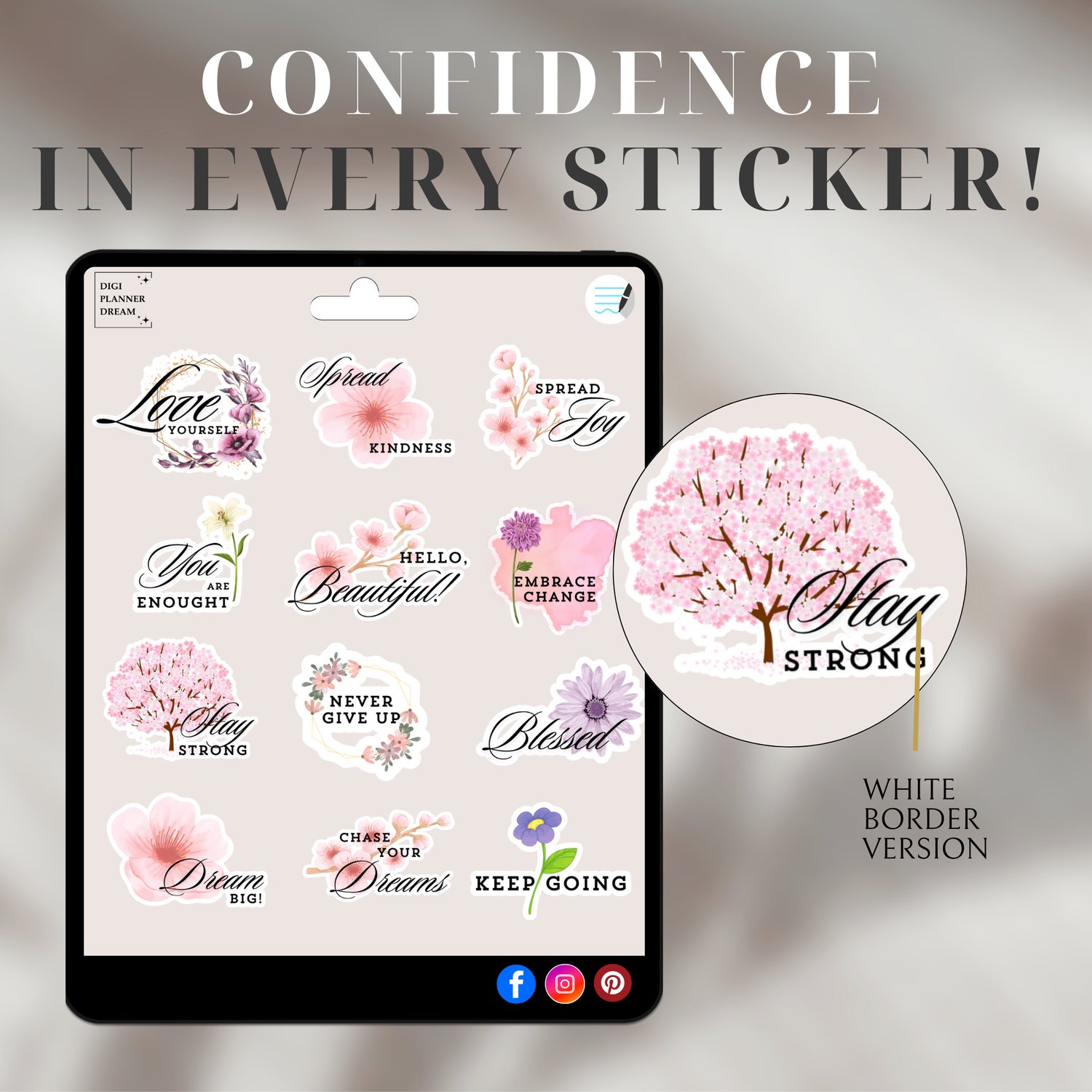 These digital stickers are designed to inspire, uplift, and promote self-love. Whether you’re planning your day, journaling, or scrapbooking, these stickers will remind you of your worth and motivate you to keep going strong. With a choice between sleek bordered stickers and clean, borderless designs, this collection offers something for every creative project!