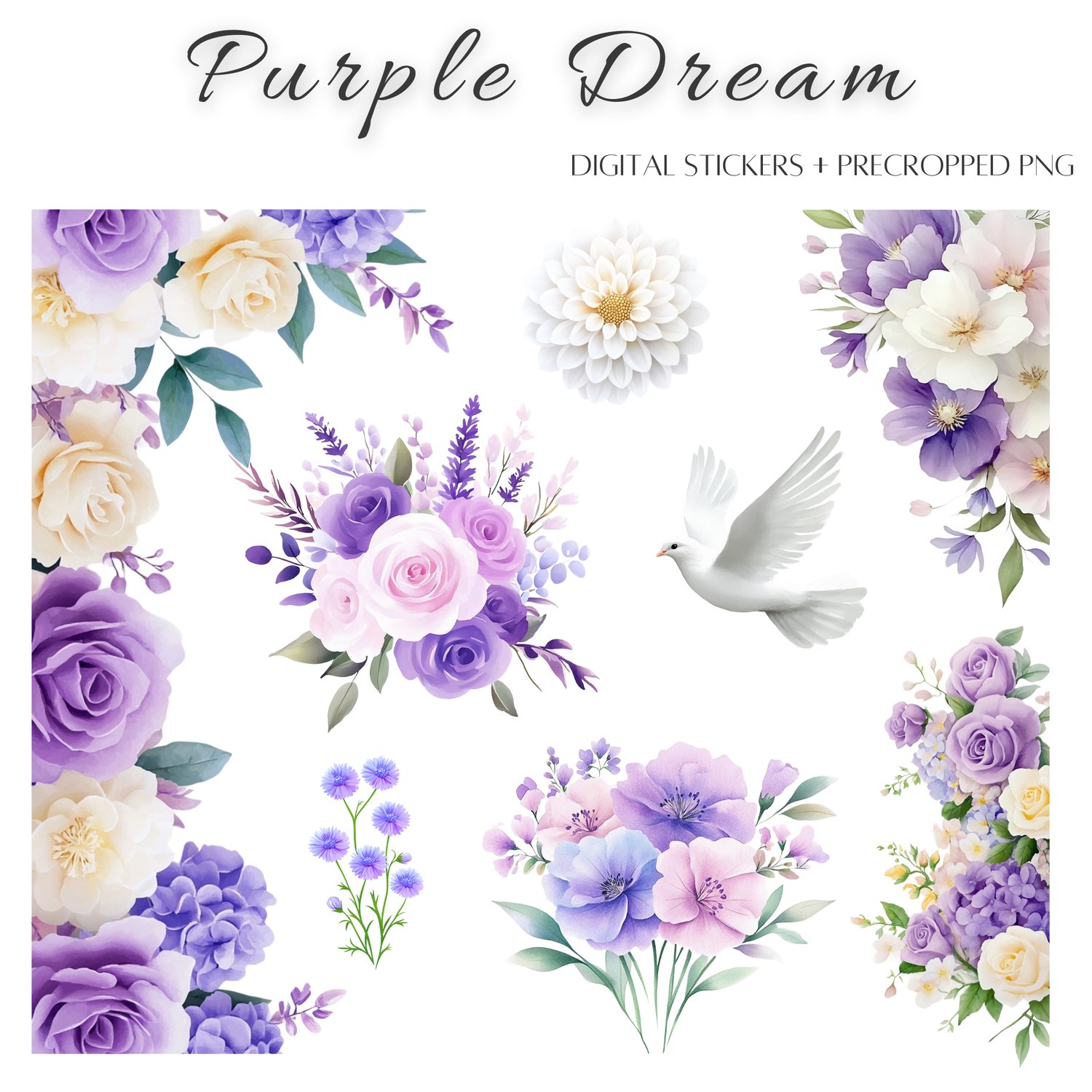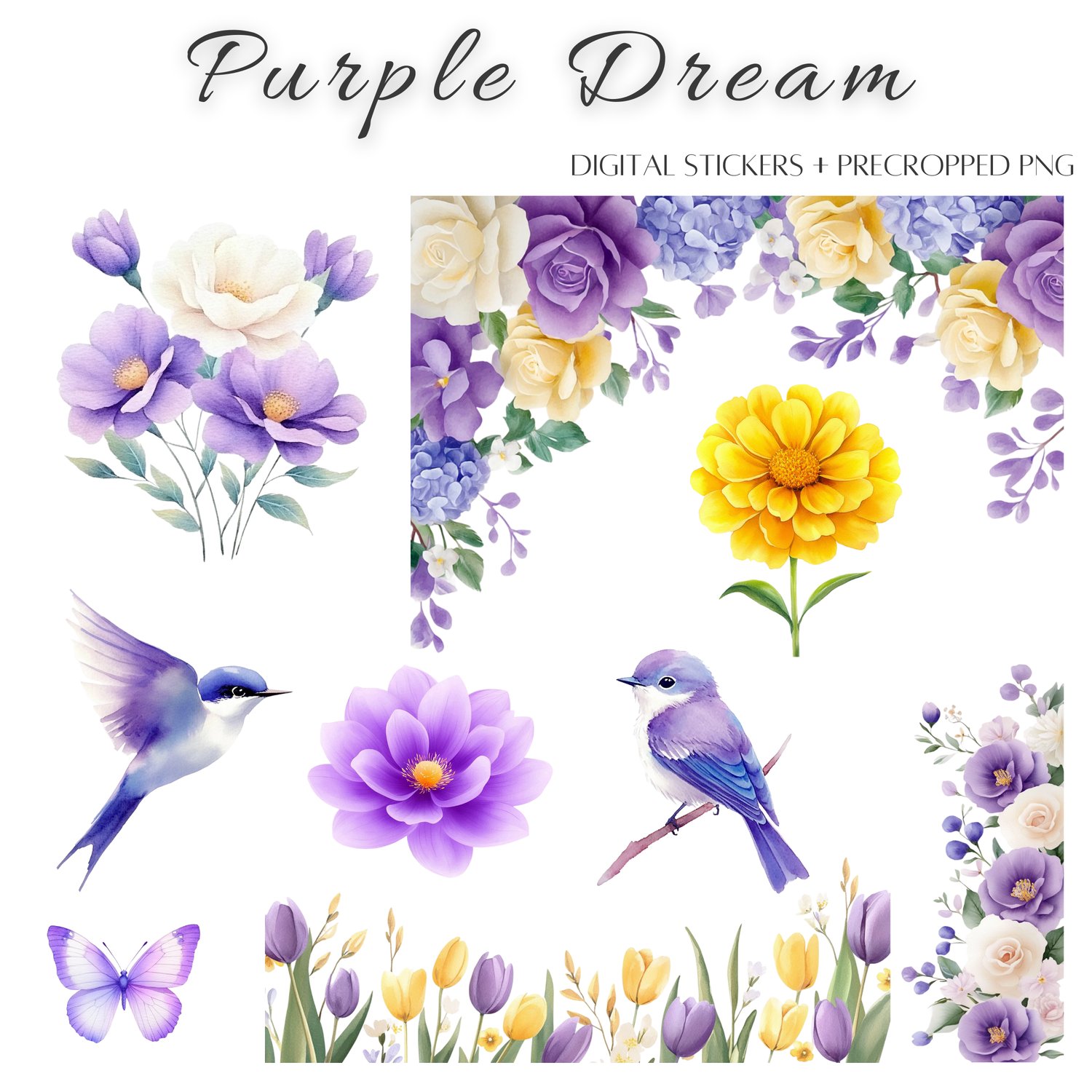 🌿 Transform your digital planner into a dreamy purple sanctuary with the Purple Dream Digital Sticker Set – perfect for anyone who loves flowers, birds, and calming aesthetics.