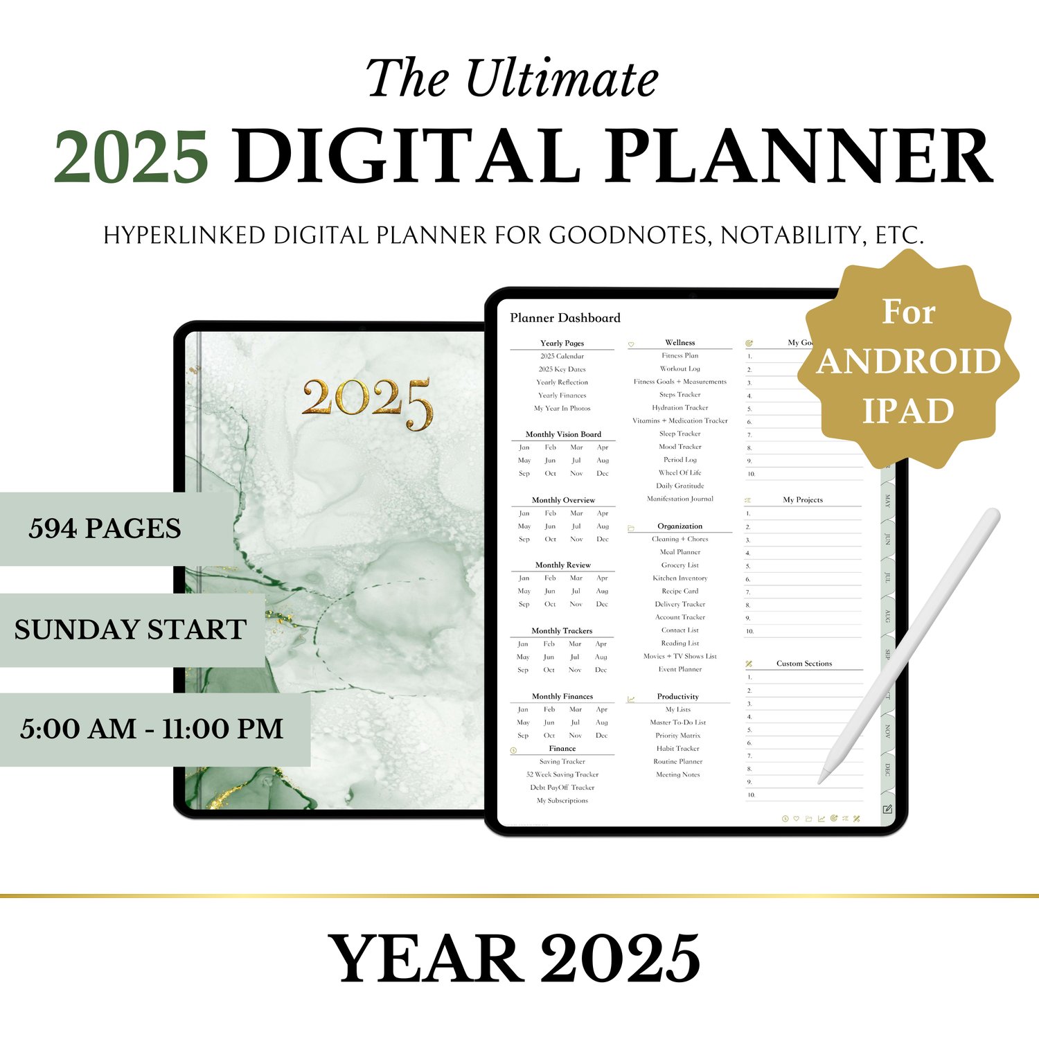 Ultimate Digital Planner, 2025, Portrait, Hyperlinked, Goodnotes, Android, Green, Wellness, Finance, Organization, Projects, Goals, Notes